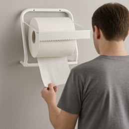 Ce distributeur de bobines nest absolument pas encombrant ! Très discret, il saura se fixer au mur sans aucun problème sans prendre trop de place grâce au nécessaire de fixation ! Dune couleur blanche alliant pureté et élégance, ce distributeur mural est à la fois pratique et économique. Son revêtement en métal en fait une référence de grande qualité et très robuste. Il dispose dun frein avec couteau inox serti sur la structure tubulaire pour permettre une découpe facile du papier et ainsi que la bobine ne se déroule pas trop, ni que celle-ci ne traîne au sol.